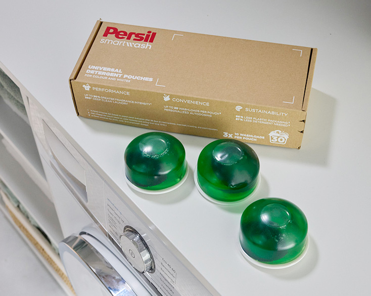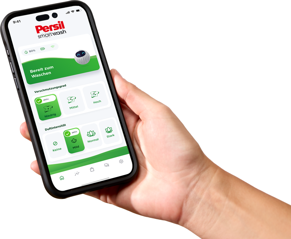 Persil Smartwash verwendet Daten von internen Sensoren und deine persönlichen Einstellungen, um die ideale Waschmitteldosierung für jeden Waschgang zu berechnen. Es bestimmt den optimalen Zeitpunkt, um Waschmittel und Duftstoffe über eine Pumpe freizugeben.